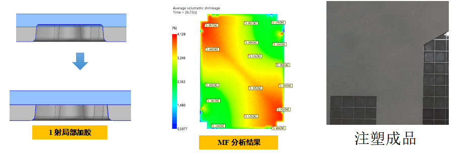 驗(yàn)證二,因前期已經(jīng)預(yù)判到會(huì)有這個(gè)問(wèn)題,第一時(shí)間跟客人溝通,將一射局部加膠,與MF分析結(jié)果一致,解決外觀問(wèn)題