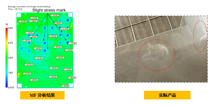 此案例中,通過(guò)MF分析提前預(yù)判縮水修改產(chǎn)品,應(yīng)力痕經(jīng)提前驗(yàn)證后縮短了改模周期及試模次數(shù)