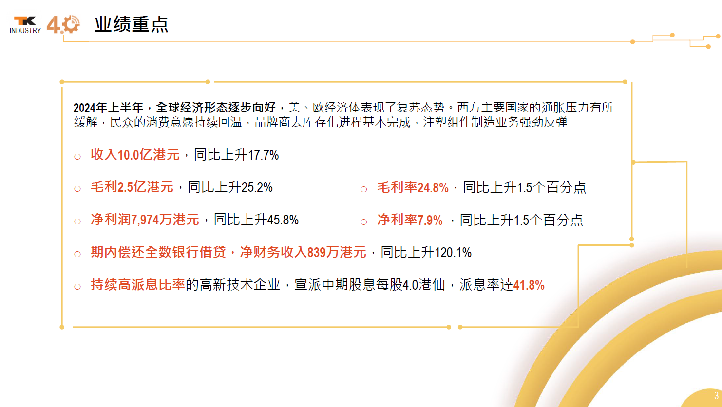 展望2024年下半年,全球經(jīng)濟活動企穩(wěn)回升。今年以來,消費電子行業(yè)景氣明顯回升,隨著產(chǎn)業(yè)鏈的庫存水平保持健康,人工智能科技賦能消費者置換熱潮,下半年將迎來傳統(tǒng)消費旺季,消費性電子產(chǎn)品終端需求預期顯著反彈。品牌商積極準備推出新產(chǎn)品,集團的模具及注塑業(yè)務產(chǎn)能在第三季度維持滿負荷水平,管理層對業(yè)務發(fā)展審慎樂觀。
